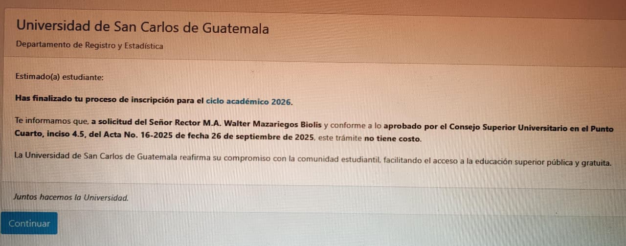 Se comunica a la comunidad universitaria que, por solicitud del Señor Rector M.A. Walter Mazariegos Biolis y en cumplimiento de lo aprobado por el Consejo Superior Universitario, en el Punto Cuarto, inciso 4.5, del Acta No. 16-2025, de fecha 26 de septiembre de 2025, se establece que este trámite no tendrá ningún costo para los estudiantes de reingreso desde el 3er. hasta el 11vo. ciclo para el año 2026.