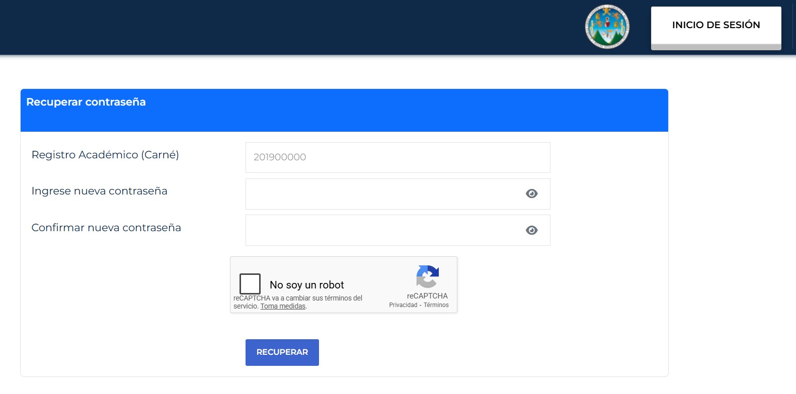 1.5. ENTONCES EN LA NUEVA PAGINA Y OPCIÓN PARA CAMBIAR EL NÚMERO PIN DE ESTUDIANTE, escriba el NÚMERO DE REGISTRO ACADÉMICO –NÚMERO DE CARNÉ UNIVERSITARIO- (completo)