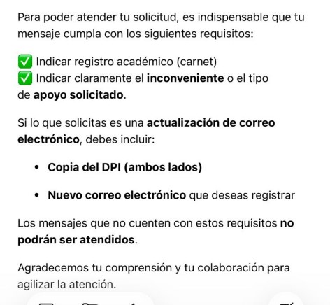 SI DEFINITIVAMENTE EL(LA) ESTUDIANTE NO RECUERDA O LE INFORMAN QUE NO TIENE NINGUN CORREO REGISTRADO, NO TIENE ACCESO O NO LE LLEGA EL CORREO ELECTRÓNICO Y NECESITA ACTUALIZARLO, ENTONCES ENVIA UN CORREO ELECTRÓNICO A LA UNIDAD DE SOPORTE DEL DEPARTAMENTO DE REGISTRO Y ESTADÍSTICA. (VER LA SIGUIENTE FOTOGRAFIA PARA VER LOS DATOS QUE DEBES ADJUNTAR AL CORREO DE SOLICITUD):