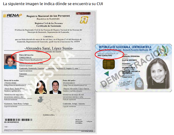 - CUI (este dato lo puede encontrar en la certificación de nacimiento o en el Documento Personal de Identificación -DPI-, extendidos por el Registro Nacional de las Personas RENAP) o No. de pasaporte (para extranjeros)*