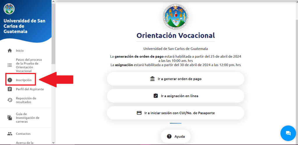 2. En el menú del lado izquierdo pulse el botón Inscripción y seguidamente en el botón IR A ASIGNACIÓN EN LÍNEA.