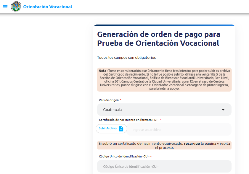 5. Seguidamente suba o cargue el archivo del CERTIFICADO DE NACIMIENTO en formato digital .PDF, que acaba de descargar de la pagina oficial de RENAP y tambien, escriba completo el código único de identificación -CUI- que aparece en su partida de nacimiento o el No. de pasaporte vigente (para extranjeros) y toda la información que se le solicita en los siguientes campos obligatorios, exactamente como aparece en su DPI o PARTIDA DE NACIMIENTO: